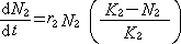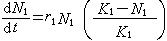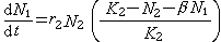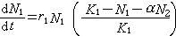 这个方程中与单种逻辑斯谛增长方程相比,只在“剩余资源”(未利用资源)项中,增加了一个αN2,表示K1资源除为物种甲(N 1)所占用以外,同时还为物种乙(αN 2)所占用。