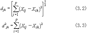 A点与B点之间的距离(d)的描述方式也很多,较常用的是布雷-柯蒂斯(3.1)距离公式,和欧氏距离公式(3.2和3.3)。公式中所用符号都是P×N 的数据矩阵X=(Xij),其中i=1,2,3,…,P个种,j=1,2,3,…,N个样方。
