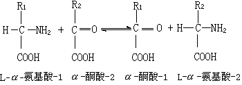 L-α-氨基酸:酮酸转氨酶广泛分布于生物界,是最重要最常见的一类转氨酶,能催化绝大多数L-α-氨基酸,与α-酮戊二酸之间的转氨基作用,少数氨基酸以单羧基的α-酮酸为受体,这类转氨酶可因L-α-氨基酸的不同而分成许多种,其催化反应的通式如下: