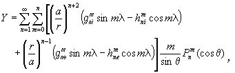 式中r是径向距离;α是地球半径;λ是经度,θ是余纬;g嬙和h嬙是内源场的高斯系数;g嚰和h嚰是外源场的高斯系数;P嬘(cosθ)是施密特形式的缔合勒让德函数,它与一般的缔合勒让德函数Pn,m(cosθ)的关系为: