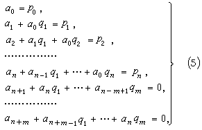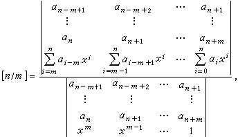 这个方程组称为帕德方程组,其中若k<0,αk=0,ql=0(l>m)。当(5)非奇异时,雅可比给出[n/m]的显式解