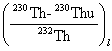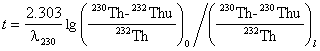 -钍(230Th/232Th)法测年230Th和232Th沉积后,通过放射性衰变,230Th的量将逐渐减少,而232Th由于半衰期比230Th长得多,其量可视为基本上不变,这样借助沉积物中230Th/232Th比值随着深度的降低,即可得出沉积物的形成年代。鉴于有时某些物理化学因素可能引起230Th的变化,这时测年如单独地根据230Th的降低,就不如利用230Th/232Th比值的降低,因即便230Th偶尔波动而比值往往不受影响,从而避免测年出现较大误差。230Th/232Th法测年的计算公式为