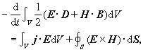 式中E、D、H、B和j分别为电场强度、电位移、磁场强度、磁感应强度和电流密度。可以看出式左为体积 V内电磁能的减少率,式右第一项是体积V内转化为其他形式的能量。当V内存在运动电荷时,它就是电磁场单位时间对V内电荷所做的机械功,转化为电荷的机械能;当V内存在导电媒质时,它就是转化为焦耳热的功率;当V内还存在电源时,其中还包括反抗非静电力对电源所做的功率。因此,从能量守恒来理解,这一方程意味着体积V内电磁能的减少,一部分用于体积V内转化为其他形式的能量,另一部分即式右的第二项,为通过界面流出去的能量。E×H即能流密度。