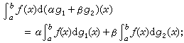 (2)线性性质。设α,β是任何两个复数,如果ƒ(x)关于g1(x)和g2(x)可积,则