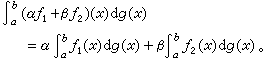 (3)区间可加性。ƒ(x)关于g(x)在[α,b]上可积,当且仅当对任何с∈[α,b],ƒ(x)关于g(x)分别在[α,с],[с,b]上都可积,此时