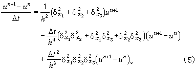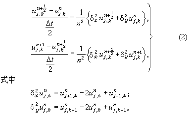 格式(2)用了两步合成一个循环,一般称之为P-R格式。由于P-R格式交替地沿各个空间方向作一维隐式计算,也称为交替方向隐式法,(2)的每个方程组都是系数矩阵为三对直线矩阵的线性方程组,容易求解,从(2)中消去