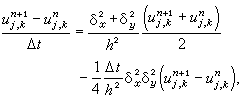 进行不同处理,一个取成显式(显式差分方法),一个取成隐式(隐式差分方法),并依次交替以保持对称性。取Δx=Δy=h时,可得出如下格式