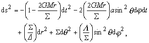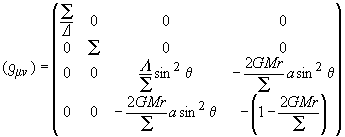 克尔度规 [拼音]:ke'er dugui [外文]:Kerr metric 1963年克尔得到爱因斯坦引力场方程的一个轴对称解。它相应于不带电的轴对称旋转物体在其外部所产生的稳定引力场,它的数学形式为: 式中采用 c =1; Σ=r2+a2cos2θ;Δ=r2+a2-2GMr;A=(r2+a2)2-Δa2sin2θ;M为物体质量;a为单位质量的角动量。克尔度规张量gμν为: 。 当a=0时,克尔度规即退化为史瓦西度规。 阅读全文
