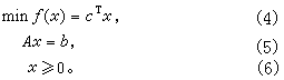 式中m≤n;αij,сj,bj为常数;系数矩阵A=(αij)的秩为m。不失一般性可设bj≥0,i=1, 2,…,m ;minƒ(x)表示求ƒ(x)的极小值。若问题中包含不等式约束αi1x1+…+αinxn≤bj,则可增加一个非负的松弛变量xn+j使之化为等式αi1x1+…+αinxn+xn+j=bj,xn+j≥0。若问题是求目标函数ƒ(x)的最大值,则可等价地化为求-ƒ(x)的最小值。若变量xj无非负要求,则可令