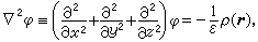 式中ρ(r)是已知的电荷密度,r是位矢,ε是介电常数,即真空介电常数ε0乘以相对介电常数εr。如区域T内无场源ρ(r),方程(1)化为拉普拉斯方程墷2嗞=0。静电场的边值问题就是泊松方程或拉普拉斯方程的边值问题,边值条件视情况而异。如果是导体面,往往是给定电势的第一类边值问题(狄利克雷问题)或给定其上的总电荷,后者相当于给定电位移D的法向分量