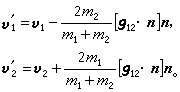 气体分子相互作用的一种基本过程。碰撞改变了气体分子的速度,大量分子频繁的相互碰撞,影响了气体的输运过程(见气体的输运现象)。在气体动力论中,不考虑分子的内部结构,不考虑平动以外的各种运动形式,因此一切碰撞都是弹性碰撞,碰撞前后动量及能量的总和都保持不变。因为三个以上分子同时碰撞的机会很少,在研究气体分子的碰撞时,只考虑主要的二体碰撞过程。在二体碰撞中,以n表示碰撞时刻由第一分子(质量为m1)的中心到第二分子(质量为m2)中心方向上的单位矢量,以g12 表示碰撞前二分子的相对速度g12=v1-v2,根据能量守恒和动量守恒定律,可以得到碰撞后二分子的速度分别为