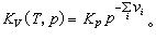 以上二式中左端的∏表示连乘,v 是正或负的整数;右端的Kp和KV分别称为定压平衡常数和定容平衡常数,Kp仅是温度的函数,而K V则是温度和压强的函数,与参加反应的各种气体的初始含量无关(见化学热力学),Kp与K V的关系为