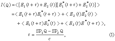 式中〈 〉表示对时间t求统计平均,τ表示经狭缝P1,P2的光的相对时间延迟,с为光速。式(1)右端前两项为E1,E2的光强,后两项为E1,E2在Q点叠加后的干涉项,描述屏上干涉条纹。若将狭缝拿掉如图1b, 用光电管接收Q,Q'点的光强, 输出随机的光电流信号n(t+τ),n'(t),