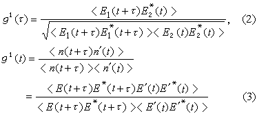 。实验表明,这两个随机信号存在一定的相关性。它们的积对时间求平均n(t+τ)n'(t)>与相对时间延迟 τ有关,这种相关性又称为光子符合计数。因为仅当n(t+τ)与n'(t)均不为零时, 其积才不为零。图1a的干涉条纹由干涉项<E1(t+τ)E壗(t)>来描述;图1d的光电流输出的相关性乃是辐射源光量子统计起伏性质的体现, 应由〈n(t+τ)n'(t)〉来描述。将这两个量归一化,便得出辐射场的一阶、二阶相关函数g1(τ),g2(τ)的定义如下