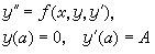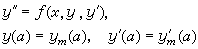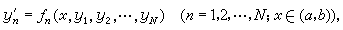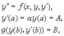 式中ƒ、g1、g2为已知函数;α与b为两个给定的端点。较一般地有一阶常微分方程组两点边值问题:求N个函数