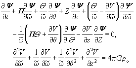 星系动力学中两个最基本的物理量是:分布函数Ψ和引力势函数 V。基本参考系通常采用原点在星系中心,基本平面在星系盘上的柱面坐标系(掚,θ,z)。(∏,Θ,Z)表示相应的速度分量,t表示时间。引力势是位置与时间的函数V(掚,θ,z,t),而分布函数是位置、速度与时间的函数ψ(掚,θ,z,∏,Θ,Z,t)。星系动力学的基本方程是:无碰撞玻耳兹曼方程与泊松方程。在柱面坐标系中它们可以写为: