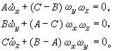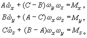 欧拉动力学方程如取过定点O 的刚体的三个互相垂直的惯量主轴(见惯量张量)为坐标系Oxyz的坐标轴,并设刚体对这三个坐标轴的主转动惯量分别为A、B、C。外力系对O点的主矩矢量在这三个轴上的投影分别为M x、My、Mz,则定点运动的刚体的运动微分方程为
