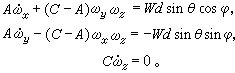 (2)拉格朗日-泊松情况。J.L.拉格朗日于1788年给出了另一种特殊情况下的解,S.-D.泊松于1813年对此情况又作了进一步研究。他们所研究的情况是:刚体只受重力W作用,重心在Oz轴上,刚体关于O点的惯量椭球是旋转椭球,即A=B的情况。如重心离O点的距离为d,则在此情况下欧拉动力学方程简化为