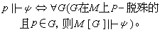 (2)真理引理 对每一在 M上 P- 脱殊的 G 吇 P,M[G]=φ[τG]匔彐p∈G(p