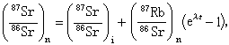 是自矿物结晶以来,由铷-87衰变而生成的锶-87含量,称为放射成因锶。λ是铷-87的衰变常数。公式(1)是同位素年代测定的基本公式。当母核的衰变形式较复杂(如有分支),或子核也非稳定核时,需对式(1)作某些修正。