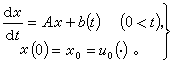 M.Γ.克列因、J.L.马塞拉等曾讨论A:J→L(Χ),b∶J→Χ连续的情形,其中L(Χ)表示 X上有界线性算子(见线性算子)。这时,方程(5)以(t0,x0)∈J×D为初值的解存在且惟一,并且在J上成立常数变易公式
