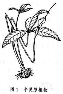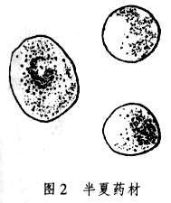 半夏多野生于山坡、溪边阴湿的草丛中或林下,中国大部分地区有分布,主产于四川、湖北、河南、安徽、山东等省。半夏呈类球形,有的稍偏斜,直径1~1.5厘米。表面白色或浅黄色,顶端有凹陷的茎痕,周围密布麻点状根痕;下面钝圆,较光滑。质坚实,断面洁白,富粉性。无臭,味辛辣、麻舌而刺喉(图2)。