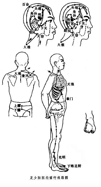 循行《帛书·经脉》两本所载此经脉之循行皆自足走向头面。甲种本所载较全,近于《灵枢·经脉》所载。然而《灵枢·经脉》改其方向而从头走足,并作了修订与补充。足少阳胆经起始于外眼角(目锐眦),上行抵达头部额角处,然后下行至耳廓后面,沿着颈侧,走在手少阳三焦经之前面,到达肩关节之上与手少阳经交叉后,又走在手少阳经的后面,向前进入锁骨上窝(缺盆)。它的一个分支是从耳廓后面进入耳中,再出走于耳廓前面,到达外眼角的后侧。此经脉又一支脉是从外眼角分出,向下至大迎穴处与手少阳三焦经会合,抵达眼眶下部(),下行过颊车穴处,向下行于颈侧,与前进入锁骨上窝一支相合,向下进入胸腔之中,贯穿膈肌,络于肝,属于本腑胆,再沿着胁肋部里面下行,出于腹股沟气街穴处,绕过前阴阴毛之边缘(毛际),横行进入髋关节中(髀厌)。它在躯干部直行向下的经脉是从锁骨上窝下行到腋窝部,沿胸部侧面经过季肋部(季胁),向下与前支进入髋关节者相合,再向下沿股部外侧(髀阳),到达膝关节部之外侧,下行于腓骨(膝外辅骨)的前面,直行向下抵达绝骨(腓骨下端露骨面处)之处,下行到达外踝的前面,沿足背上面,进入第四趾(小指次指)末端。此经脉的又一分支从足背上面分出,进入足大趾之间,沿足大趾缝处,第一、二跖骨分叉部(歧骨)的内侧,出于足大趾之末端,然后返回来贯穿大趾之爪甲,出于甲后丛毛(三毛)处(见图)。