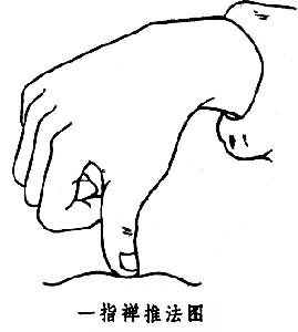 一指禅推拿的常用手法有一指禅推法、拿法、按法、摩法、滚法、捻法、抄法、搓法、缠法、揉法、摇法、抖法等十二法。主要手法为一指禅推法,或称一指禅功。操作要领是:沉肩,垂肘,悬腕,指实掌虚。用拇指指端螺纹面或偏峰(外侧端)着力,并以腕关节左右摆动,带动拇指关节行伸屈活动,速度每分钟在120~160次左右。操作时可根据需要,随腕关节的摆动使拇指端缓慢地沿经络移动,紧推慢移,压力、频率及摆动幅度要均匀,使力量持续地作用于经络穴位,做到推穴位而走经络。手法有正推、侧推和屈掌旁推三法。一般要求拇指着力,其余四指不接触被推的穴位(见图)。