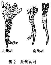 柴胡多生于干燥的荒山坡、田野、路旁及干燥草原。北柴胡产于吉林、辽宁、河南、山东、安徽、江苏、浙江、湖北、四川、山西、陕西、甘肃、西藏等地。狭叶柴胡产于黑龙江、吉林、辽宁、内蒙古、河北、山东、江苏、安徽、甘肃、青海、新疆、四川、湖北等地,习称红柴胡、细叶柴胡。按性状不同,分别称北柴胡、南柴胡。北柴胡呈圆锥形,常有分枝,长6~15厘米,直径0.3~0.8厘米。表面黑褐色或浅棕色,具纵皱纹、支根痕及皮孔。顶端多带有残留的茎基或短纤维状的叶基。质硬而韧,不易折断,断面显片状纤维性,皮部浅棕色,木部黄白色。气微香,味微苦。南柴胡根较细,多不分枝或下部稍分枝,表面红棕色或黑棕色,靠近根头处多具明显的横向疣状突起,顶端密被纤维状叶基残余。质稍软,易折断,断面略平坦,具败油气(图2)。