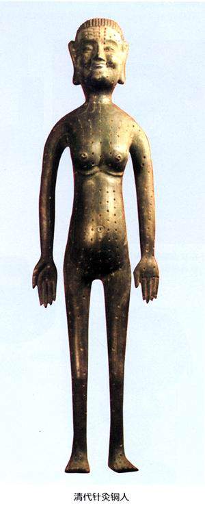清代针灸铜人1742年,清政府令吴谦等编撰《医宗金鉴》。为奖励主要编撰者,曾铸若干具小型针灸铜人作为奖品。这批铜人,现上海中医药大学医史博物馆藏有一具,系女性形状,高46厘米,实心,表面有经络、腧穴,但人体造型欠匀称。现中国历史博物馆藏有一具针灸铜人,高178厘米(见彩图插页)。有人误认为这就是明正统年间仿宋重铸的铜人。其实该铜人的形制与北宋铜人出入甚大,实际是晚清铸造的。