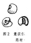 主产于河北、福建、辽宁等省,其他地区多亦有产。薏苡仁呈宽卵形或长椭圆形,长4~8毫米,宽3~6毫米,表面乳白色,光滑,偶有残存的黄褐色种皮。一端钝圆,另端较宽而微凹,有一淡棕色点状种脐。背面圆凸,腹面有一条较宽而深的纵沟。质坚实,断面白色粉性。气微,味微甜(图2)。