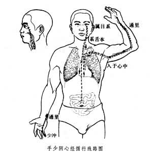 循行《帛书·经脉》甲种本所载此经脉循行似近于今之手少阴经在上肢内侧后缘的线路;乙种本所载则近于今之手厥阴经在上肢内侧中间的线路。《灵枢·经脉》沿用甲种本线路,但反其方向而从脏走手。手少阴心经起始于心中,出来之后则属于与心相联系的“心系”(即各种组织之意)。然后下行穿过膈肌,络于小肠。此经脉之分支是从“心系”上行,在食管(咽)两旁直达与眼睛相联系的“目系”(即眼球根部各组织)。此经脉在胸部与上肢的直行脉是重由“心系”分出后返行向上与肺相连,然后向下出于腋窝之下,沿着上臂内侧后缘,走在手太阴与手厥阴经之后侧,下行至肘关节内侧后方,再沿着前臂内侧后缘,抵达掌后腕关节部的尺侧豌豆骨突起(手锐骨),进入手掌内尺侧一边,然后沿着小指的桡侧到达其末端,接于手太阳小肠经(见图)。