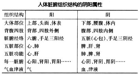 阐释人体的组织结构中医学认为人体是一个有机的整体,人体内部充满着阴阳对立统一的关系。故《素问·宝命全形论》指出:“人生有形,不离阴阳。”人体的一切组织结构,既是有机联系的,又都可以根据其部位和功能特点,划分为相互对立的阴阳两部分,并进而说明它们之间存在着对立统一的生理联系(见表)。应当指出,由于层次不同,人体脏腑组织结构的阴阳属性也有所不同。