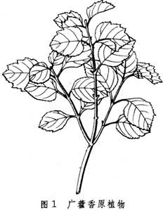 广藿香茎略呈方柱形,多分枝,枝条微弯曲,直径0.2~0.7厘米;表面被柔毛,质脆,易折断,断面中部有髓;老茎类圆柱形,直径1~1.2厘米,被灰褐色栓皮,木质坚硬。叶对生,皱缩或破碎,展平后呈卵形或椭圆形,长4~9厘米,宽3~7厘米,边缘具不整齐的钝锯齿,两面均被灰白色茸毛(图1)。气香特异,味淡微苦。