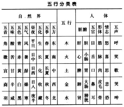 五行学说应用于中医学就是以五行归类的方法以及生克乘侮、亢害承制的变化规律,具体地解释人体生理、病理现象,指导临床医疗实践。中医学的藏象学说是在阴阳五行学说指导下以五脏为中心的学说。五行配五脏曾有四五种不同的配法,后来才确定为现在通行的配属法,即肝属木,心属火,脾属土,肺属金,肾属水,赋予五脏及其类属以五行的特性。如木性可曲可直,枝叶条达,有生发的特性,而肝体阴而用阳,喜条达而恶抑郁,有疏泄功能,故以肝属木。火性温热炎上,心阳有温煦之功,故以心属火。土性敦厚,能生化万物,脾能运化水谷精微,营养脏腑肢骸,为气血生化之源,故以脾属土。金性清肃收敛,而肺清肃之性,以肃降为顺,故以肺属金。水性润下,有寒润、趋下、闭藏之性,肾有藏精主水之功,故以肾属水。又以五脏为中心,将其与五官、五体、五志、五声等人体组织器官和生理功能联系起来。进而将自然界的事物也按五行的性质,用取象比类的方法归纳为五方、五季、五色、五味、五音等。将这些不同的事物用五行与五脏及其类属联接起来,使人得以较全面地把握自然界运动和生命运动的变化规律,以此来说明人体的整体性和人与自然界的统一性,从而指导临床实践(见表)。例如《素问·阴阳应象大论》对木一类事物的看法,认为东方能生风气,风能使木气旺盛,木能生酸味,酸能滋养肝脏,肝气又能滋养于筋,关联于目,在五色为苍(青),在五音为角,在五声为呼,在情志的变动则为怒等,其余四行以此类推。
