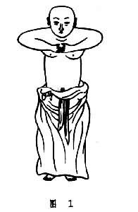 韦驮献杵第一势左足向左平开一步,两手自然下垂;头身正直,平视前方,心境澄清,气定神敛。两手慢慢变为阴(掌心向下)并向上抬起与肩平,然后两掌向胸前靠拢,合十当胸,指尖向上(图1)。用腹式呼吸,意送丹田。