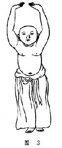 接上势,两手缓缓从两侧上举,将阴掌变为阳掌,两手指尖相对,复于前额前上方,作托天状。同时两足跟提起,牙关紧咬,舌抵上腭(图3)。然后,两手握拳,顺原来路线缓缓回归。