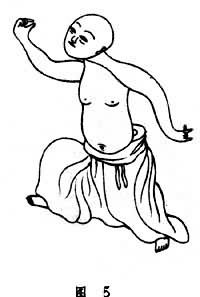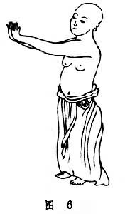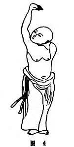 接上势,右手向右上方微微举起,距额一拳宽,同时左手放下并反手以手背贴于右侧腰部。两目向上注视右手手心(图4)。然后,左手向上覆额,右手向下并以手背贴于左侧腰部。