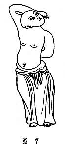接上势,右手向上提,朝脑后做圆周运动,用掌心贴于脑后,右腋张开;左手向左方划,反手的手背贴于两肩胛间,左腋紧闭(图7)。继前式,右手放下,反手提起,以手背贴于两肩胛间;同时左手提至脑后。反复数次。