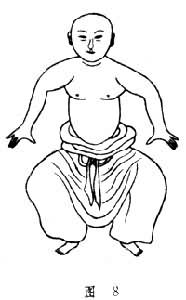 接上势,两手向左右平伸,成一字形,掌心向下,同时左足向左跨一大步。慢慢下蹲呈骑马势;在下蹲的同时,两掌亦缓缓下按,按压至与膝相平为止(图8)。随后将下按之掌翻转,手心向上,如托物状,随两腿的慢慢伸直一起上升,与胸相平为止。如此反复数次。