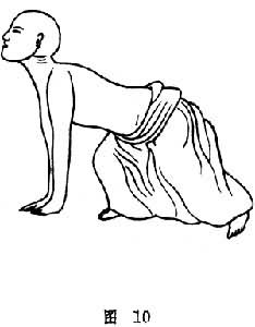 接上势,抬起右腿向右前跨一步,成弓步,同时两手向前,五指着地,掌心悬空。头向上略抬(图10)。将前足收回,先做一个下俯,臀部慢慢后收,两目平视。随后将头昂起,似扑食之状。如此反复数次。最后还原至两足与肩等宽的站式。