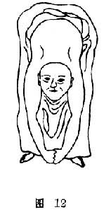 接上势,两足与肩等宽,立身正直。两手抱头,掌心按耳,两中指尖轻触,两肘屈曲。慢慢俯身弯腰,将头向两膝的空裆之间弯下,以极限为度,两腿挺直,腰胯放松,舌抵上腭,咬紧牙关(图11)。随后,慢慢直立起来。反复数次。