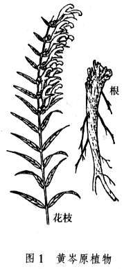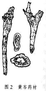 黄芩多生于草原、高燥砾质的山坡。主产于河北、山西、内蒙古、河南、山东、陕西、黑龙江、辽宁等地。黄芩呈圆锥形,扭曲,长8~25厘米,直径1~3厘米。表面棕黄色或深黄色,有稀疏的疣状细根痕,上部较粗糙,有扭曲的纵皱或不规则的网纹,下部有顺纹和细皱。质硬而脆,易折断,断面黄色,中间红棕色;老根中间呈暗棕色或棕黑色,枯朽状,已成空洞。气微,味苦(图2)。