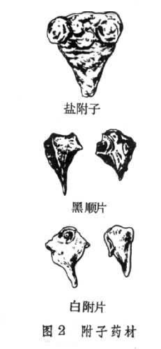 白附片的形状、气味与黑顺片相同,无外皮,黄白色,半透明,厚约0.3厘米(图2)。黑顺片、白附片均直接入药;盐附子须再用清水反复浸漂后,与甘草、黑豆共煮,至口尝无麻舌感时,切片制成淡附片入药。