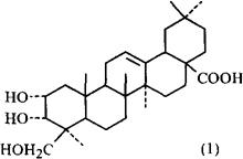 化学性质根中含三萜皂甙、树脂、脂肪油[1]、远志醇四乙酸酯[2],地上部分含有4种新的皂甙,即瓜子金皂甙甲(瓜子金皂甙元-木糖-鼠李糖-葡萄糖甙)、瓜子金皂甙乙(28-0-[βD-葡萄吡喃糖(1→2)-β-D-葡萄吡喃糖(1→2)-β-D-葡萄吡喃糖]瓜子金皂甙元)[4]。瓜子金皂甙元是一种新的五环三萜类衍生物,即(2α,3α,24三羟基齐墩果-12-烯-28-羧酸)(1)[5]。