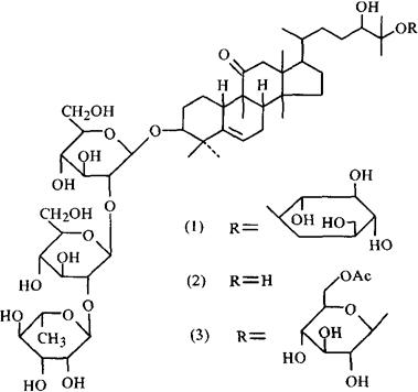 含一种新的引产有效蛋白,命名为β-天花粉蛋白(β-Trichosanthm)分子量为28000,分子中不含半胱氨酸,活性是天花粉蛋白(Trichosanthin)的二倍[1]。另据报告还含另一种引产有效蛋白,效价比栝楼和日本栝楼所含蛋白质高6倍[2]。还含胡芦烷型(Cucurbitane type)三萜皂甙:氧化葫芦烯四糖甙(1)、氧化葫芦烯三糖甙(2)和氧化葫芦烯乙酰葡萄糖四糖甙(3)[3]。精氨酸、胆碱、棕榈酸甲酯、甾醇类化合物等[3-4]。