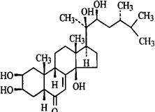 从子实体分得7个新成分,命名为多孔菌甾酮A(1)和B~G(Polyporusterone A~G)[3]。尚含25-去氧罗汉松甾酮A(25-Deoxymakisterone A)和25-去氧-24(28)-去氢罗汉松甾酮A[4],前者为(1)的22和24位的差向异构体。上述化合物对白血病L-1210均有细胞毒活性[3,4]。
