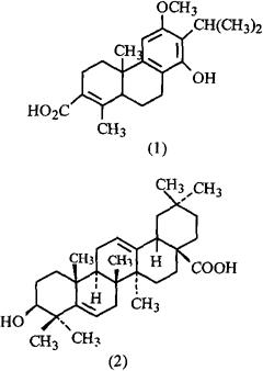 近年来有不少文献报道其成分,大致情况如下:①从根中又提取分离到:雷公藤内酯甲,乙(Wilforlide A,B)、雷酚萜醇(Triptenoterpenol)、美登叶酸(Maytenfolic acid)、雷公藤二萜醌Ⅵ(DiterpenequinoneⅥ)、l-表儿茶素、β谷甾醇[1]、山海棠萜酸(Hypoglauterpenic acid)(2)、雷公藤三萜酸A(Triptotnterpenic acid)、3-表山楝酸(3-Epikatonic acid)、齐墩果酸及其3-乙酸酯[2]、雷公藤羟内酯(Tripdiolide)、3-氧齐墩果-12-烯-29-酸(3-Oxoolean-12-en-29-oic acid)、富马酸[3]、山海棠二萜内酯A(Hypodiolide A)、雷藤二萜酸B(Triptoditerperuc acid B)[4]、3-氧木栓烷-29-羧酸甲酯、3β,22α-二羟基-△12-齐墩果烯-29-酸甲酯、3β,22α-二羟基-△12-熊果烯-30-酸甲酯、3-表山楝酸甲酯(3-Epikatonic acid methyl ester)[5]等。 ②从茎中分离到:雷酚二萜酸(Triptonoditerpenic acid)(1)[6]、雷公藤内酯甲(Wilforlide A)、3β,22α-二羟基-△12-齐墩果烯-29-酸、富马酸[7]、以及雷酚萜醇(Triptonoterpenol)和l-表儿茶素(l-Epicatechin)[8]等。