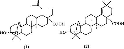 化学性质干皮含胶质16.3%~21.6%[1,2];叶含槲皮素、槲皮甙-3-鼠李糖-7-葡萄糖甙,异槲皮素、槲皮素-3-阿拉伯糖甙、槲皮素-3-二葡萄糖甙、槲皮素黄酮甙、芸香甙、槲皮甙、槲皮素的二糖甙(D-葡萄糖和L-阿拉伯糖、D-茑萄糖和L-鼠李糖)[2]、Mononic acid、雷公藤内乙酯(Wilforlide B)、雷公藤内甲酯、3β,22α-二羟基-△12齐墩果烯29-羧酸、没食子酸[3]、Benulin(Lantabetulic acid)(1)、3β-25环氧-3α-羟基、△20(29)羽扇豆烯-28-羧酸)和丝木酸(Bungeanicacid,即3β,25-环氧-3α-羟基-△13-齐墩果烯-28羧酸)(2)[4,5]。