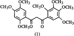 全草中分得新的七甲氧基二酮化合物:3′,4′,6′,2″,3″,4″,5″-七甲氧基-1,3-二酮查耳酮(1)[3′,4′,6′,2″,3″,4″,5″-Heptamethoxy-1,3-dikitochalcone]及已知化合物槲皮素-3-O-鼠李二糖甙、金丝桃甙、木犀草素-6-C葡萄糖甙和β-谷甾醇葡萄糖甙[2]。